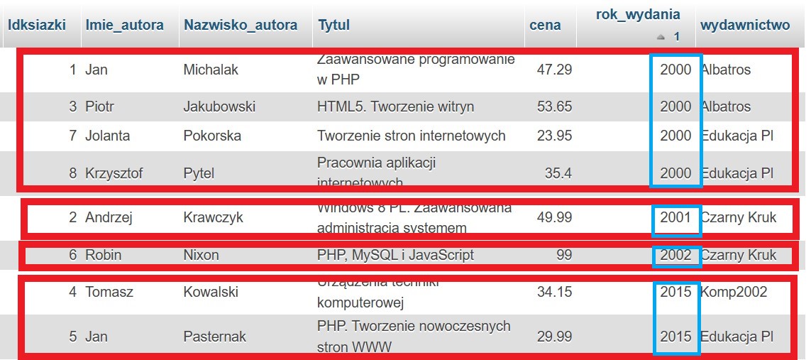SELECT rok_wydania, COUNT(*) as "Liczba egzemplarzy" FROM ksiazka GROUP BY rok_wydania; SELECT rok_wydania, ROUND(AVG(cena),2) FROM ksiazka GROUP BY rok_wydania; SELECT miejscowosc, COUNT(miejscowosc) as "Liczba klientów" FROM klient GROUP BY miejscowosc ORDER BY 2 DESC; SELECT rok_wydania, COUNT(tytul) AS "Liczba egzemplarzy" FROM ksiazka GROUP BY rok_wydania; rok_wydania Liczba egzemplarzy 2000 4 2001 1 2002 1 2015 2 SELECT rok_wydania, COUNT(tytul) AS "Liczba egzemplarzy" FROM ksiazka GROUP BY rok_wydania HAVING rok_wydania>=2010; rok_wydania Liczba egzemplarzy 2015 2