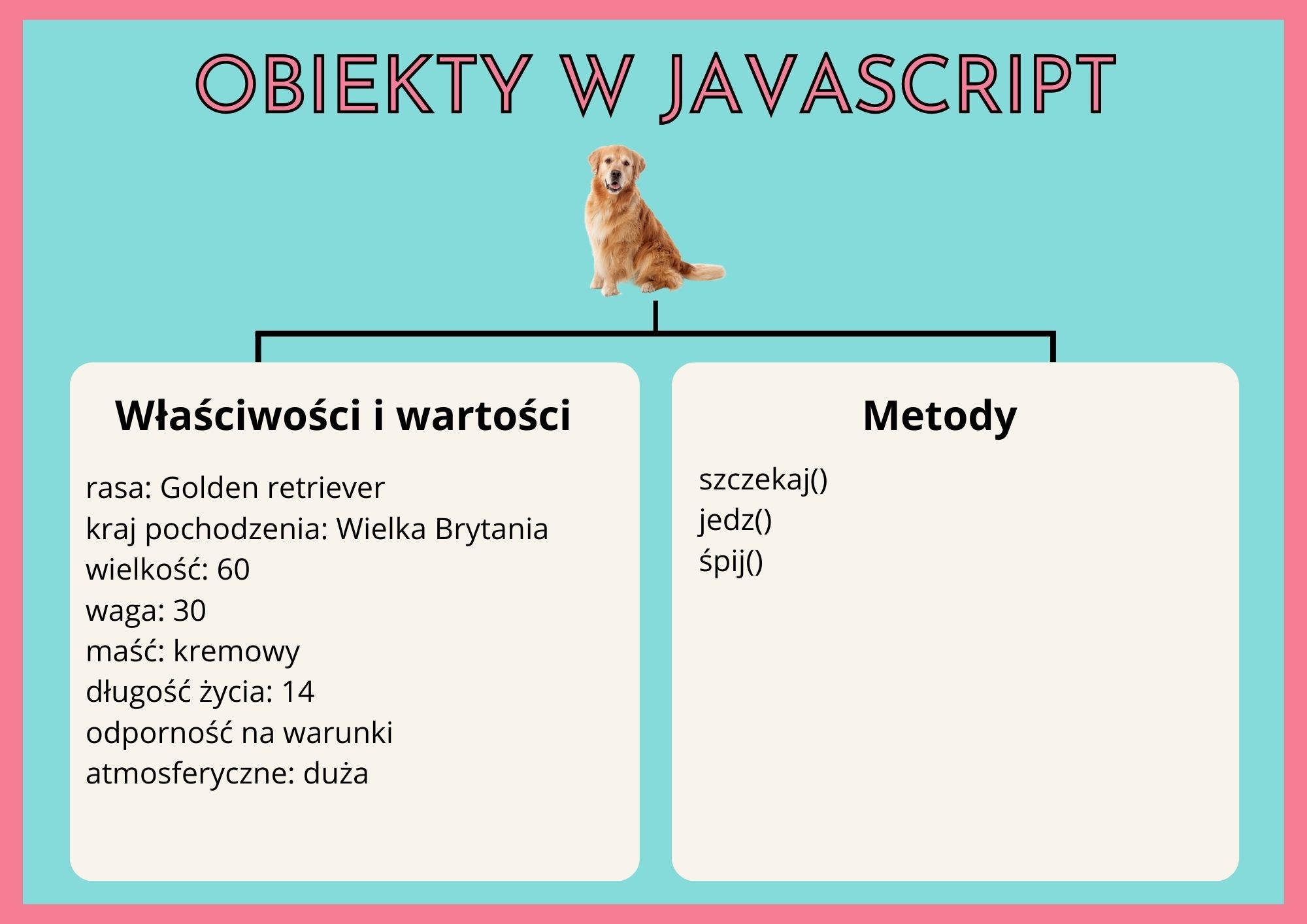 W JavaScript obiektem jest prawie wszystko, co nas otacza, np. pies, książka, uczeń. Obiekt posiada właściwości, np. właściwościami psa mogą być rasa, kraj pochodzenia, wielkość, waga, maść, długość życia, odporność na warunki atmosferyczne itp. Pies potrafi np. szczekać, jeść, spać - to są metody. Wszystkie psy posiadają te same właściwości, ale właściwości mogą przyjmować różne wartości dla poszczególnych psów. Wszystkie psy mają te same metody, ale są one wykonywane w różnym czasie.